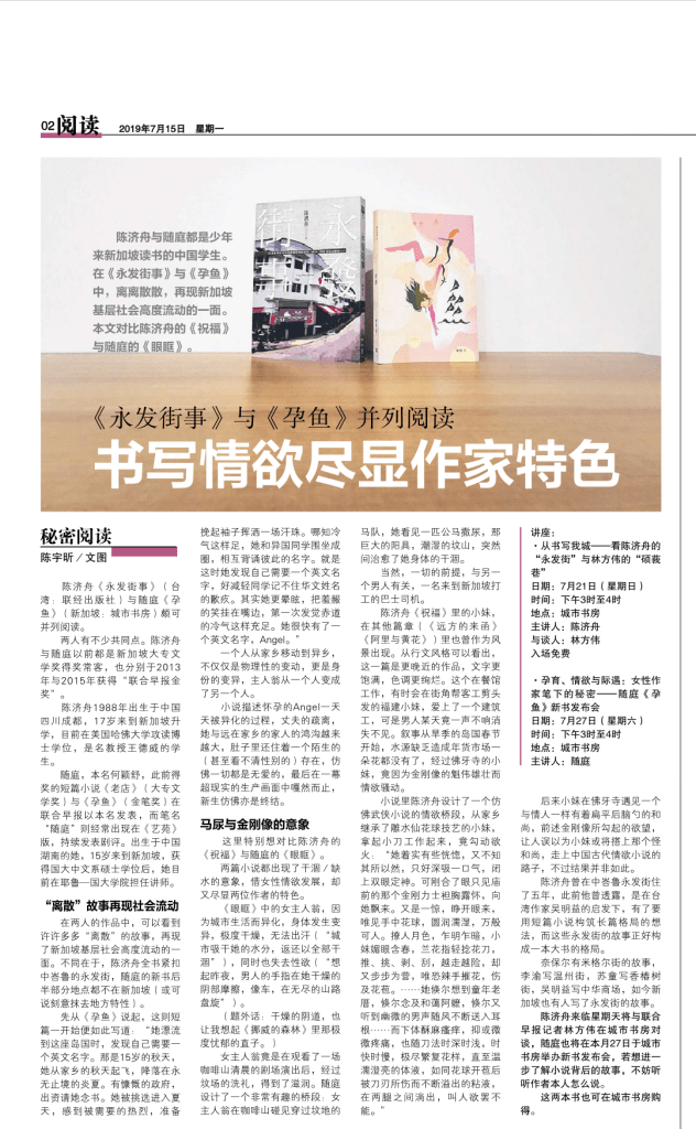 《孕鱼》收录八部短篇小说,包括2015年金笔奖中文小说组首奖《孕鱼》与2015年新加坡大专文学奖小说组首奖、联合早报金奖作品《老店》。《孕鱼》是关于一个女人遭遇海难时将整条鱼生食,然后怀了身孕的故事。随庭以充满奇幻色彩的人鱼意像,隐喻女性生育的命题,刻画出人的存在状态与意境。而《老店》则叙述得了怪病的老店主突入一段历史记忆,交错地叙述老店与老主人命运重叠的结局,情节虚实相生,展现传统和现代发展之间的格格不入,深刻又触动人心。 本地作家杜南发评价 “《老店》和《孕鱼》风格迥异,文笔随叙事而变化,表现作者舒展自如的多样化功力。”